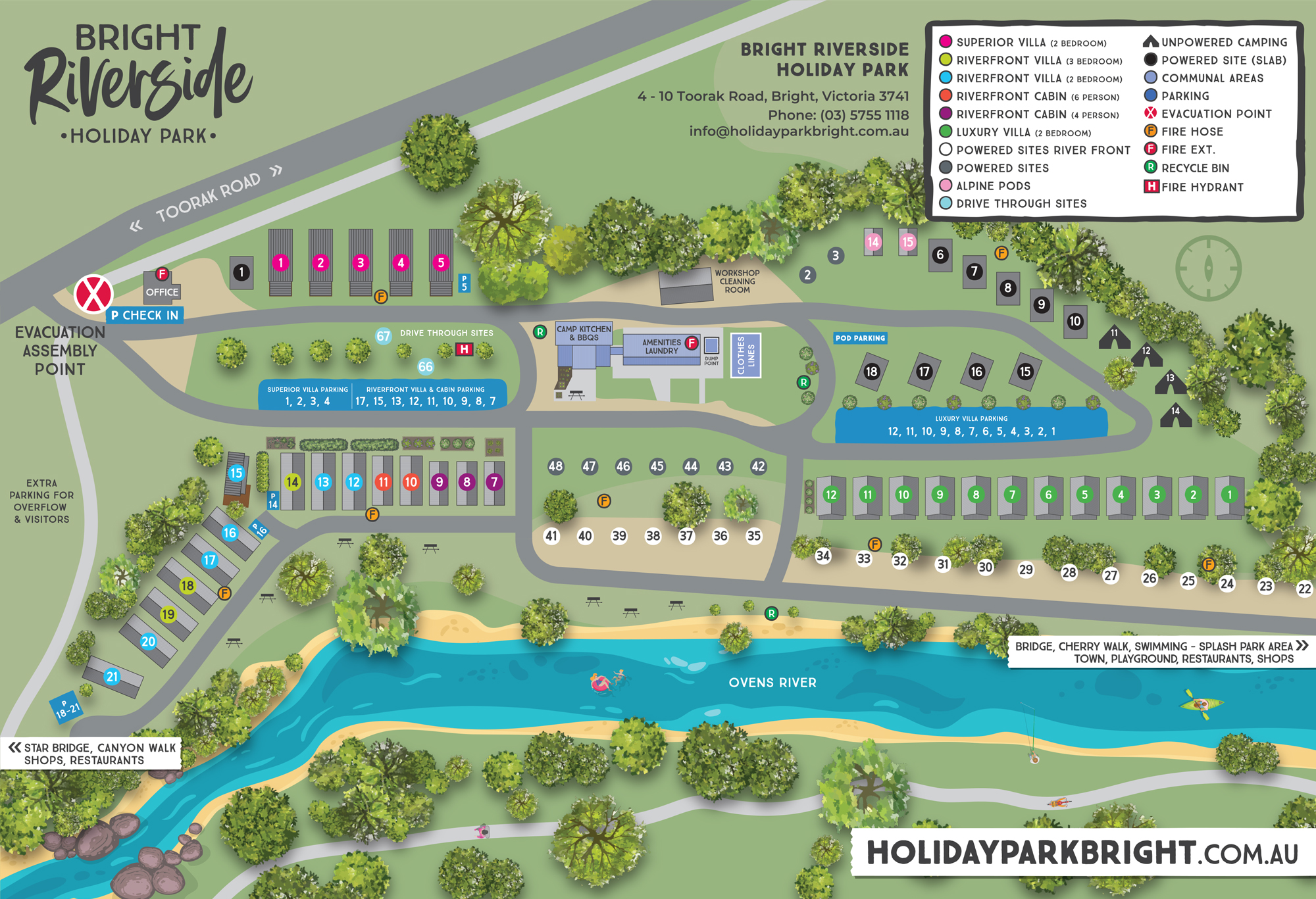 Familiarise yourself with the Bright Riverside Park Map below to make your arrival at our park even smoother. Or you can always speak to our friendly staff for assistance or to answer any questions – Contact us!