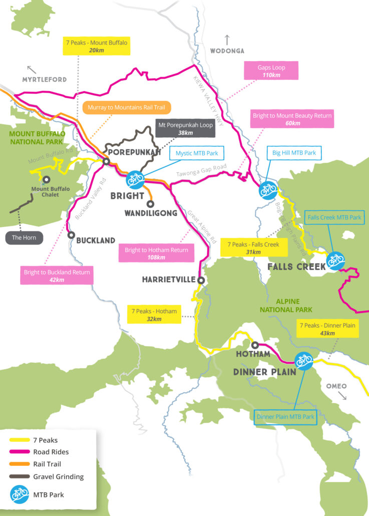 Whether it’s taking on a challenging mountain ride or cruising a back country road, you will be rewarded with crisp alpine air and breathtaking scenery when tackling the tarmac around Bright and surrounds. The town is a great base for taking on four of the popular 7 Peaks Rides of Hotham, Falls Creek, Dinner Plain and Mount Buffalo, some of Australia’s toughest road climbs.