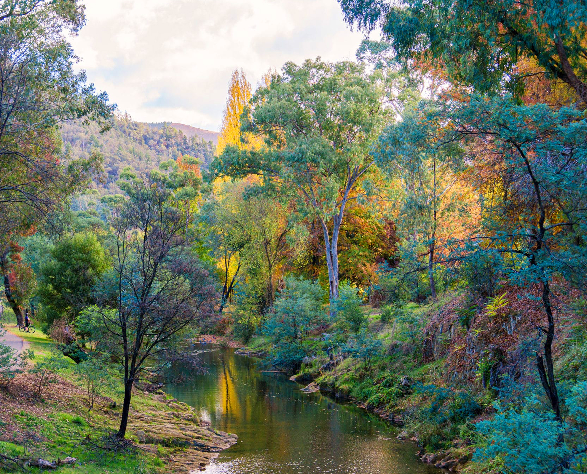On the return drive, stop in at Bogong Village and go for a short walk around Lake Guy. This is one absolutely stunning spot in Autumn.