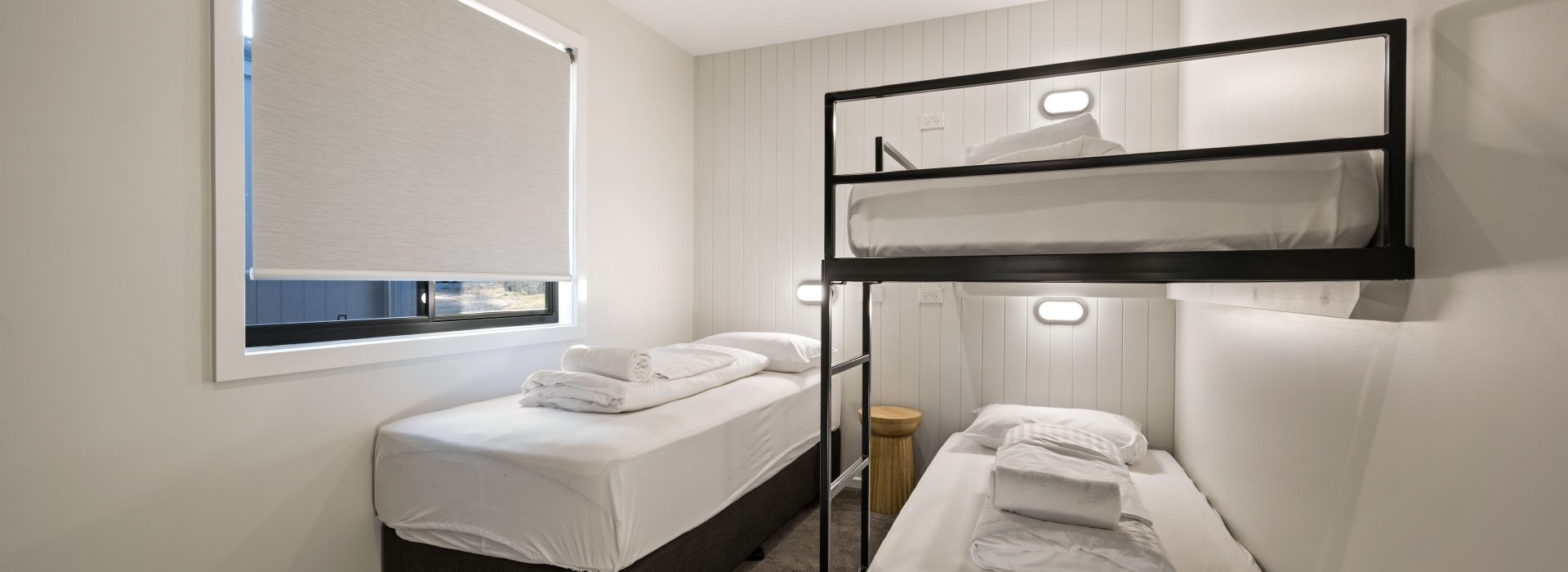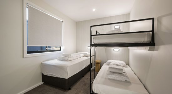 Each cabin features two spacious bedrooms. The master bedroom has a luxurious queen bed. The second bedroom offers a set of bunks and a single bed, making it ideal for up to 5 guests.